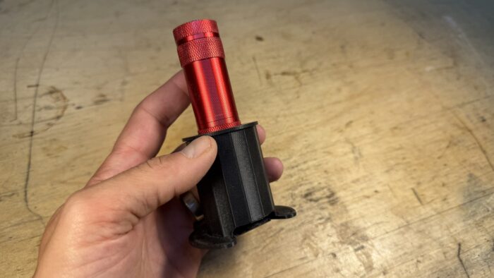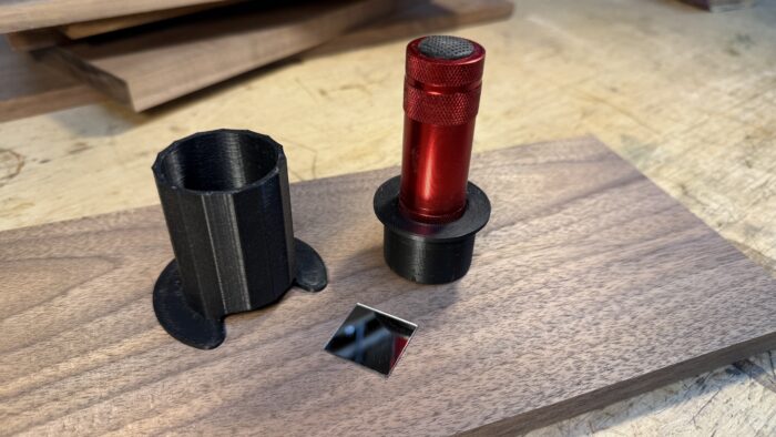 It’s a simple flashlight holder. It consists of two 3D printed parts, a base with an angled face to mount a mirror, and a socket for a small flashlight. I used a one-inch square mirror, but you can use just about any reflective surface, like foil tape, or even the inside of a snack bar wrapper, which will work just fine. The tool is designed for a one-inch diameter flashlight; the one in the photos can be purchased for $3 for a pack of two at your favorite budget tool store.
