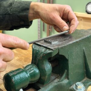 Create the cutter. Use a permanent marker to lay out the shape of your bead on the scrap-metal blank. Secure the blank in a vise, and use a round file (at 90° to the blank) to create the profile. The scratch stock will cut in both directions, so hone both faces of the cutter on a fine stone. And hone the curved edge as well.
