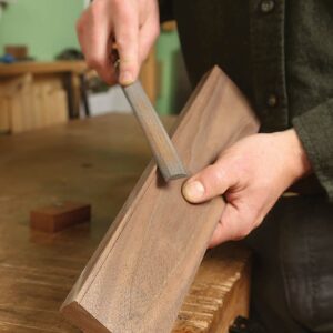 Prepare the holder. Draw a layout line on an L-shaped block, and then use a handsaw or bandsaw to cut a kerf along that line. At the end of the block, use a Forstner bit to cut a shallow countersink for a bolt head. Then drill a clearance hole for the bolt. Assembly. After sliding the cutter into the kerf in the handle, put the bolt in place, and tightly secure a nut on the end.