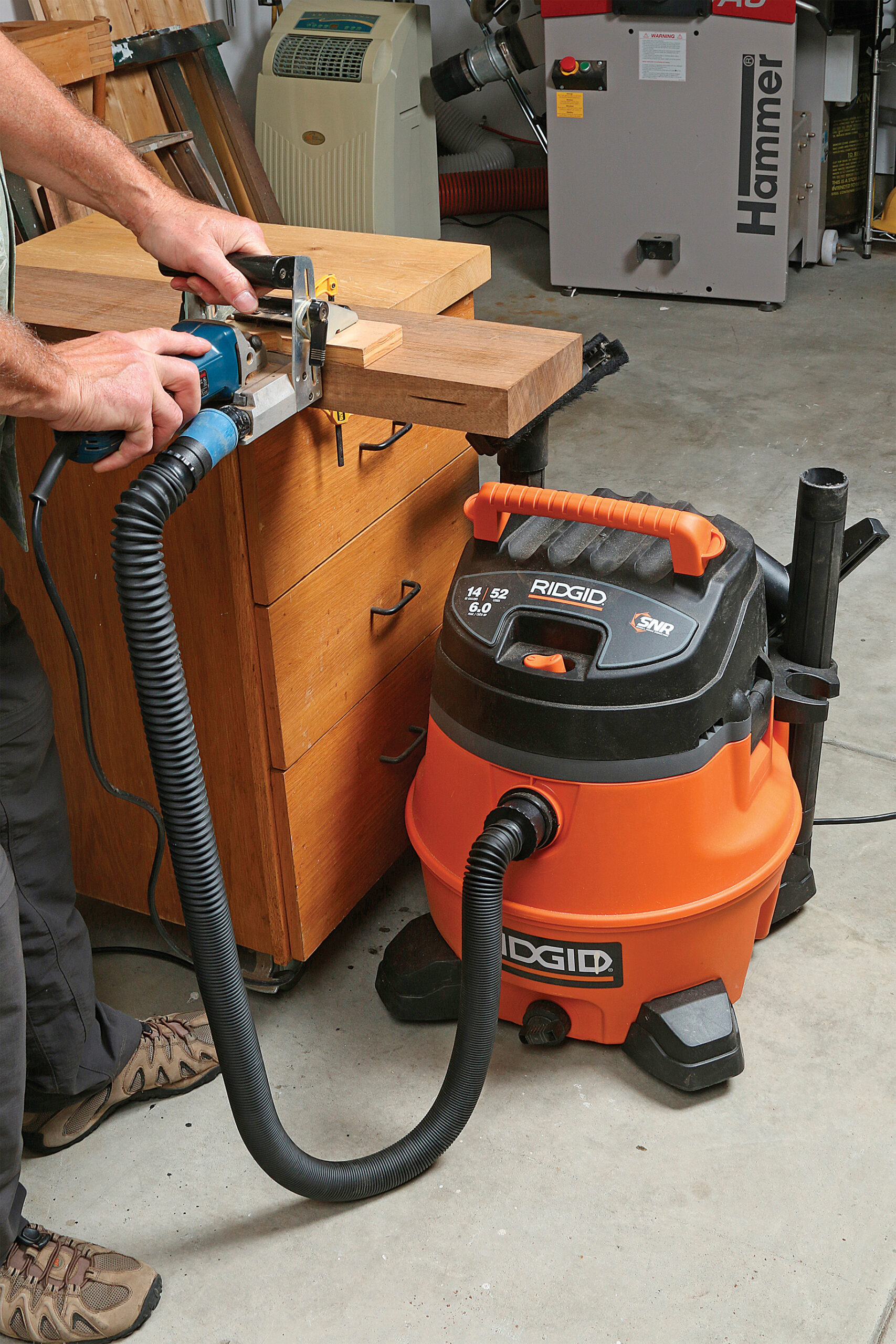 A dust collector is also more capable of grabbing sawdust from a tablesaw and bandsaw, again because of the large volume of airflow. That said, I’ve had pretty good luck using a shop vacuum hooked up to a 14-in. bandsaw and a benchtop tablesaw that has a built-in dust housing under the blade. For larger machines, and especially if you plan to do a lot of resawing or dadoing, the dust collector would do a better job than a shop vacuum, whose hose can sometimes clog when