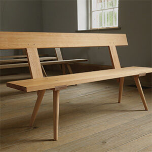 The first version of this bench was based on photos of Mayan pyramids and made with sycamore, stained green, to suggest a forest canopy. After recently visiting the pyramids of Giza, Tony made this one—identical in form, but in walnut. The simple V-shaped incisions, chiseled along tapering chamfers, are painted in the color palette commonly found in ancient Egyptian tombs and temples. TONY O’MALLEY, Emmaus, Pa.