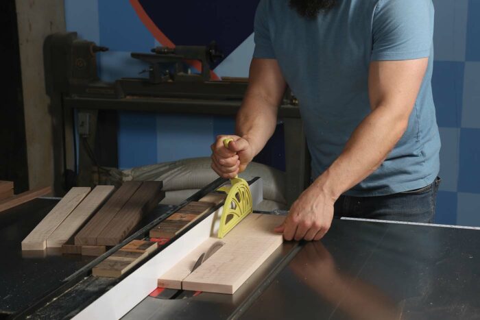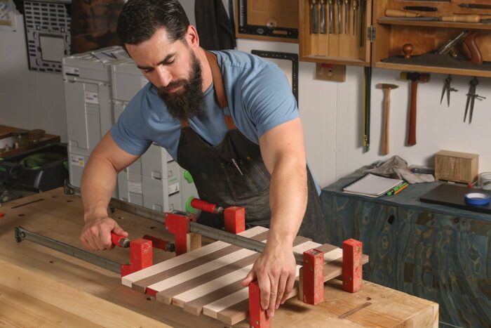 After thicknessing, I chop my boards to around 20 in. long and then take them to the table saw. This is where the first critical measurement comes into play. Set the fence carefully to 2 in., and rip four strips of walnut and four strips of maple. Be sure to have a good, sharp blade, as any blade deflection or burn will show through on the final piece. Try to leave the saw set up if you can; it will make life much easier down the road. With the strips ripped to final width, lay them up in an alternating pattern and edge-glue them. I like to use Titebond III here, as there are multiple strips and the extra open time of TB3 is helpful for alignment purposes, though it’s not critical. Keep the strips flat, and use cauls if necessary.