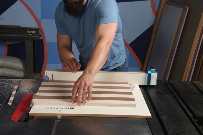 Go back to the table saw and, using a crosscut sled, cut across the grain to square up one side. Remove the sled, place the lamination against the fence, and cut strips to the same 2-in. width. Place the strips off to the side, keeping them in order.