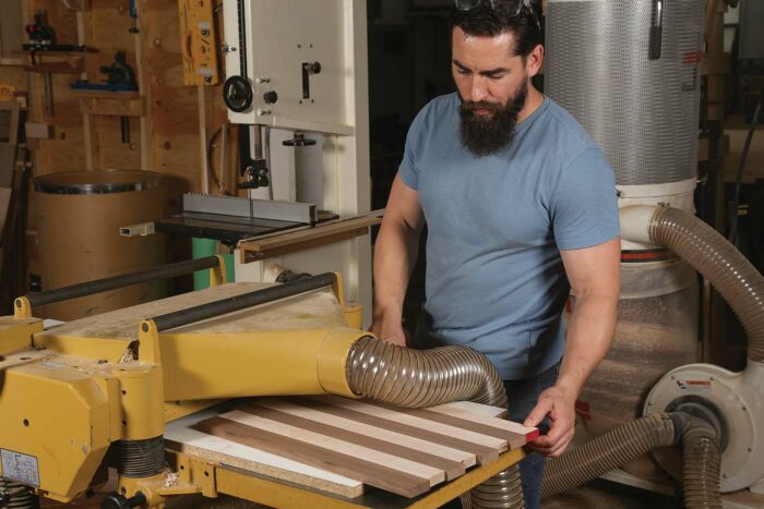 I finish my board at 5/8 in. thick, but to start I mill the stock down to around 3/4 in. Bear in mind that I have a 22-in. planer, so planing this down to final thickness after gluing up is no problem for me. However, if you have a 13-in. planer and have to finish this with a hand plane or random-orbit sander, consider taking your boards down to 11/16 in. so there is less work for you down the road. Working with thinner stock just means you will have to be more mindful during the glue-ups.