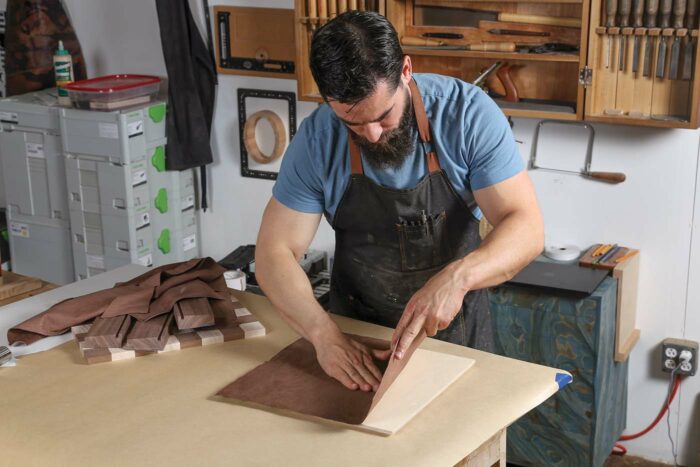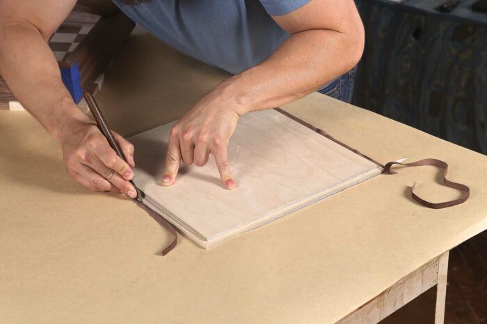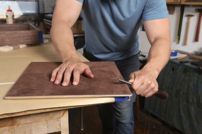 The rabbeted plywood bottom makes a good template to size and cut the suede. Placing the suede under the template and pressing firmly, use a sharp knife to cut the suede a bit oversize. With a small chip brush or flux brush, spread a thin layer of yellow glue on the box bottom. Carefully glue the suede in place, and press it smooth with a brayer. Once the glue is dry, cut the suede to exact size with the knife.