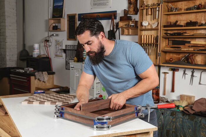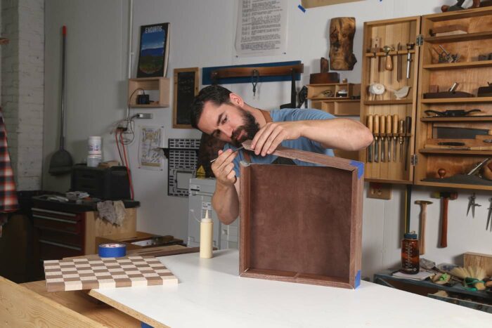 After a couple hours, remove the clamps and blue tape and prep the outside walls of the box. A light sanding or a few passes with a sharp plane will do the trick. Then, with a block plane, put a heavy chamfer around the bottom edge of the chessboard and the top outside edge of the box. Be sure the chamfers are sizable, as they will act as a finger pull to remove the board from the box.