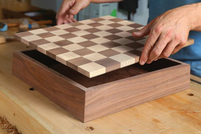 Stunning grain sits atop a mitered storage base.The humble chessboard is an enticing project for woodworkers of all skill levels. You can pick just about any technique you want to learn or improve and employ it in building a chessboard without spending exorbitant amounts of cash on materials. Are you a new woodworker who needs to practice accurate machining skills and glue-ups? Are you a seasoned woodworker yearning to improve your casework skills? Make a chessboard with storage space! Or maybe you have that one stick of curly maple that’s just too beautiful to toss in the burn bin but isn’t quite big enough for any of the projects you normally tackle. Guess what? You need less than 2 bd. ft. of material to make a simple chessboard. So pull that stick from the dusty box of sacred offcuts, get a sharp rip blade in the table saw, and invite over that one friend who takes chess way too seriously—because we’re about to make a fantastic little chessboard and storage box.