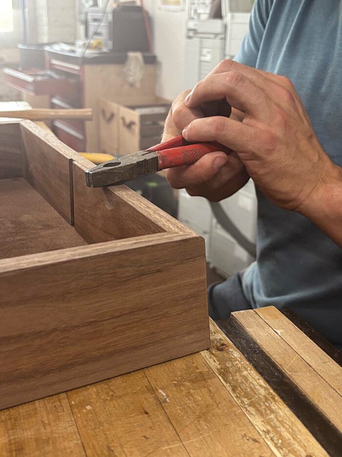 I prefer a darker wood for a base, as dark colors have more visual weight to them, grounding the object and making whatever sits atop feel a bit more important. Consequently, I’ll use more of the same straight-grained walnut that I used on the top. The joinery is miters, the bottom is trapped in a groove, and a center divider creates separate compartments for the pieces.