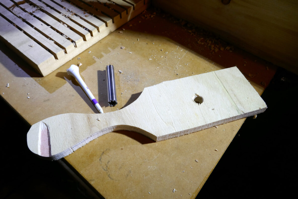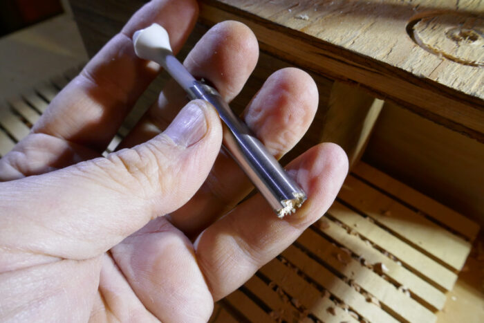 Once the core is fully formed, remove the boring cylinder from the chuck and push the core out using a golf tee or a wooden dowel. If the core is still attached to the reclaimed wood at the bottom, break it free using pliers, a screwdriver, or an awl.
