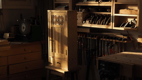 I teach quite a bit and this wall cabinet is probably one of my favorite things to teach. It’s not that big of a piece, but it packs in a ton of woodworking information. There’s dovetailed case construction, through mortise-and-tenon joinery, a traditional dovetailed drawer, and a frame-and-panel door. Between all those things, that’s 90 percent of the things that you need to know to build just about any piece of furniture. There are a lot of quiet design elements that define this piece, and one loud thing–the kumiko panel. Making kumiko is a really fun technique and it’s something I’ve been incorporating into my work for the last few years, and I still haven’t exhausted the possibilities with it. -Mike Pekovich