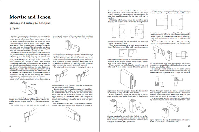Synopsis: There are a great many variations of the mortise-and-tenon joint, writes Tage Frid, and the task of the cabinetmaker is to know which variation to use for a particular application and why, and then how to make it quickly and well. In this extensive article, he explains the history of the joint and basic differences between mortise-and-tenon types — lap joints, slip joints, haunched mortises, mitered haunched mortises, and more. He examines dozens of mortise-and-tenon joints and their associated strengths and weaknesses, and then explains how to make them with hand tools. Photos illustrate the steps involved.