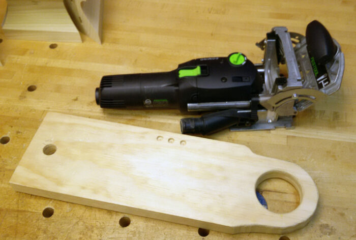 To join the legs to the column sections, I use a Festool Domino, but floating tenons or splines or dowels or even screws can do the job, as you’ll see shortly. For irregular small parts, I vise-mount the Domino upside down in a simple fixture and bring the work to the tool.