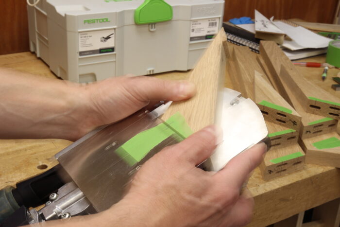 Before glue-up, clean up the front-facing “ankle side” surfaces and add any planned edge treatments. If you stuck to the reference surfaces, all of the planing will be down-grain and downhill from the joint line.