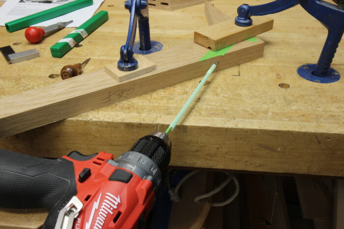 If your bit wanders, you can force it back now with a bit large enough to let the screw threads slide through the column. Make a deep center punch on the leg blank where you want the screw to go, and dry-assemble the joint with the Dominoes. Use the long bit to drill the pilot hole in the leg. It should find the center punch.