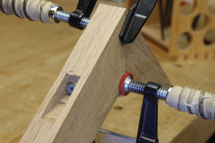 These are some awkwardly shaped parts to glue together. After testing cauls with hooks, glue blocks, and a couple of table-mounted wedgie-thingys, I arrived at a K.I.S.S. solution: screws as clamps.