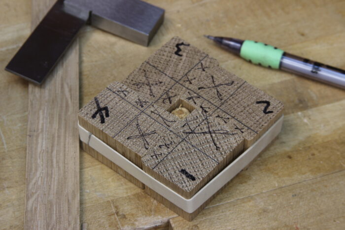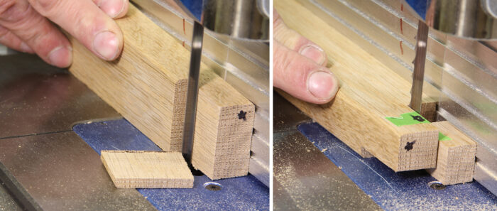 Use the cutoffs on a sled to set the cut depths at the table saw. My cuts to each leg are identical and run in a circle around the center. If you used an asymmetrical spacer, they won’t be. Take your time marking cuts and waste, remembering that the offcuts’ layout is upside down. Free the waste at the bandsaw.