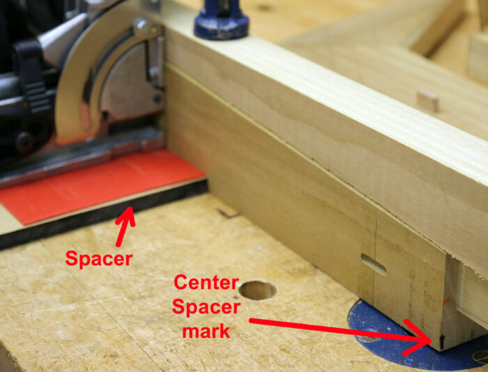 When cutting for Dominoes, I used a 3/8-in.-thick spacer to cut the faces with the black center marks. With all of the joinery cuts done, this is a good time to do any sanding or other cleanup work before assembly.