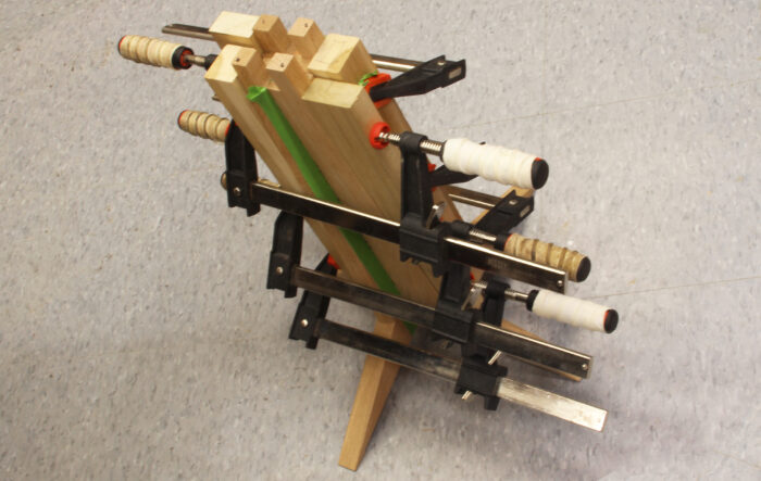 Myko uses clever clamping methods to assemble the pedestal base of the table.In the last post, Teamwork Table, we cut out all of the parts to build the central column and married them into pairs with each foot and a column leg matched up for grain. Now it’s time to assemble each pair, and then the full pedestal.