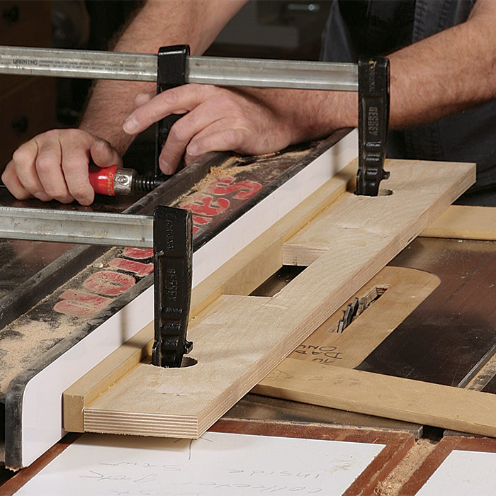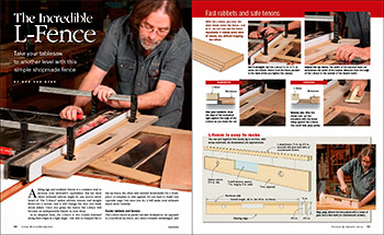 Synopsis: This is one tablesaw add-on that you won’t want to live without. The L-fence makes quick work of rabbets, tenons, and straight flush-cuts. It helps you to cut accurate miters, make precise cuts on awkward parts, and add versatility to your saw. In its simplest form, the L-fence is two boards fastened along their edges at a right angle. One side is clamped flat to the rip fence; the other side extends horizontally for a workpiece or template to ride against. But because this fence is raised slightly above the table, it doesn’t get damaged like a sacrificial fence would.