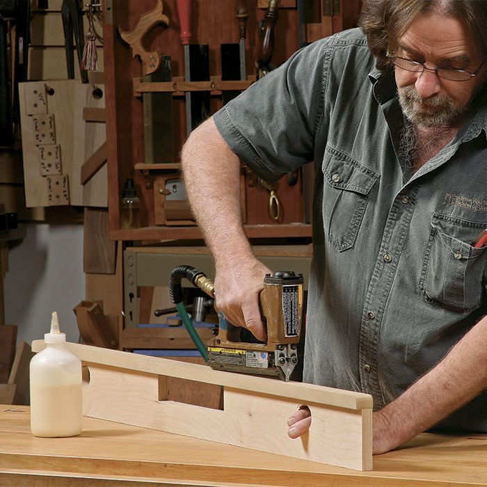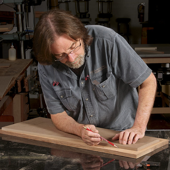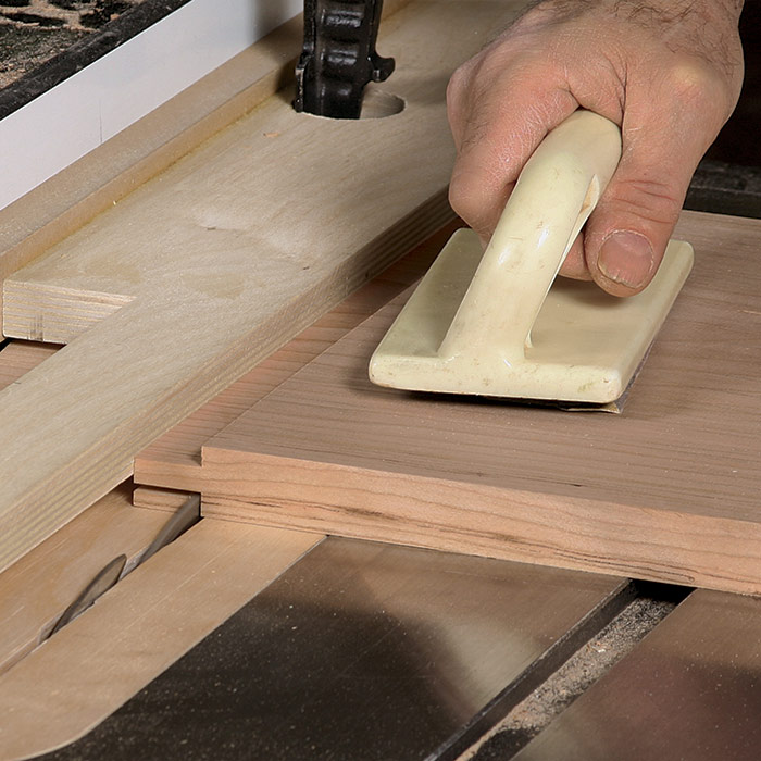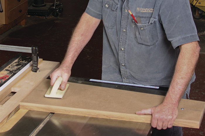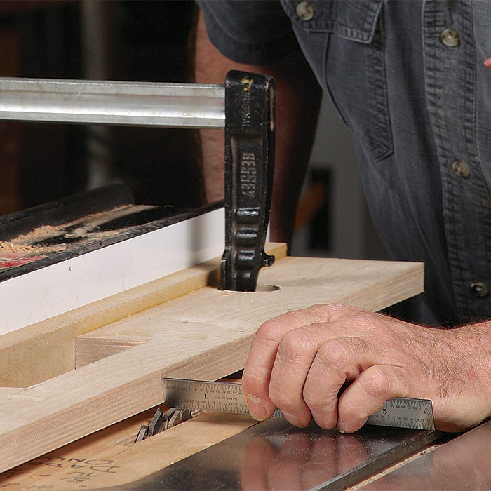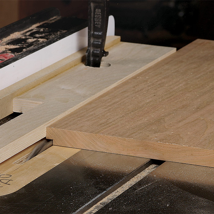 Once you have the fence set up as shown on the opposite page, and you’ve cut the sides to final size, you attach straightedges flush to the edges. I cut the opposite side of my straightedges at 45° so they’ll work as clamping cauls during assembly. With the fence and blade set up as shown, run the case sides so the straightedges bear against the L-fence.