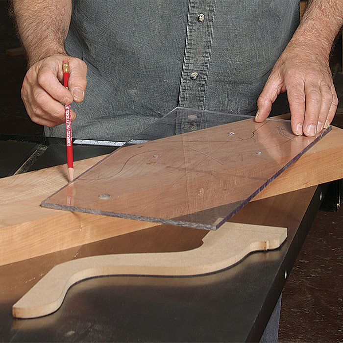 Once you’ve laid out your pattern on the template stock, use a straightedge as described above, but this time reposition the straightedge multiple times for multiple cuts, until the shape is complete. Now that you have your template, you can use the L-fence—again, set up for flush-cutting—to duplicate any straight-sided part. Trace the template on the workpiece, then use a bandsaw or jigsaw to trim the waste to within 1⁄4 in. of the line. No need to be fussy, but keep in mind that the waste side of the cut can’t be wider than the L-fence itself or the rip fence will be in the way. Big offcuts take up more space between the blade and the rip fence and need to be cleared out more often to eliminate the risk of kickback. You can use double-sided tape to attach the template, but I use screws when possible, placing them in areas that will be cut away later—like the through-mortises for the Arts and Crafts bookshelf below.
