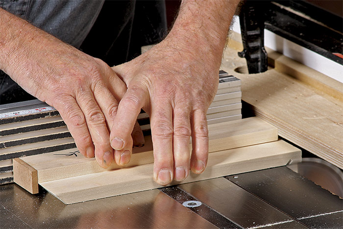 For a quick and easy way to cut identical box sides, start with the same L-fence setup. Rough-cut the box sides close to the approximate final length, and use a miter gauge to miter one end. Cut gauge blocks to the finished length of the pieces you need. Tack a lip to one end of each block to create a hook. This will grab the knife edge of the first miter on each workpiece, and the block will bear against the L-fence as you make the cut on the other end.