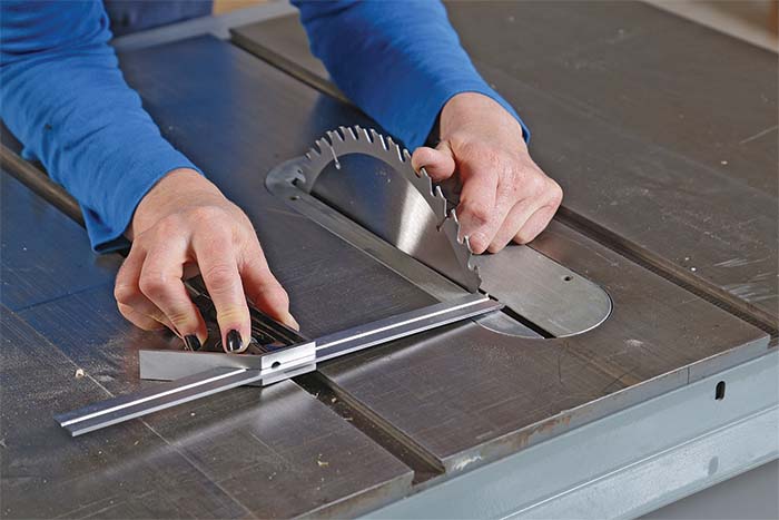 Now that the blade is at 90°, you’ll adjust the tabletop so the miter-gauge slots are parallel to the blade. Put the square’s head against the left side of the right-hand slot and the ruler at the front of the blade. Carefully slide the ruler out toward the blade until it lightly rubs a tooth. If you’re using a rip blade, pick any tooth. If the blade’s a crosscut or combination, pick a rip tooth or a tooth angling to the right. Once the ruler slightly touches the tooth, lock the square in that setting.