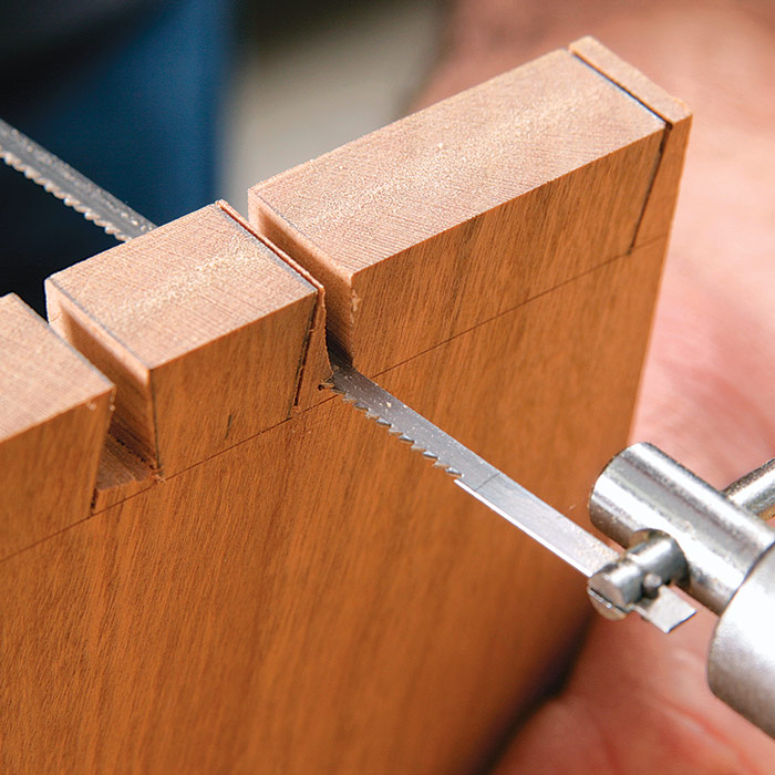 Handsaws are great for getting into tight spaces, too. A coping saw is the perfect tool to cut out the waste between dovetails. The thin blade can fit into even the tightest pin socket and make a turn along the baseline, removing the waste in seconds. Chopping out waste with a chisel takes much longer, and routing it out is possible only when there’s enough clearance between the tails to fit the bit.