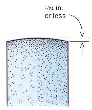 First, you probably need to make a few changes to your bench grinder. An aftermarket tool rest is the key to getting those perfect bevel angles quickly and easily. Next, you’ll need to outfit your grinder with a cooler-running “friable” wheel. The standard grey wheel that comes packaged with most grinders generates way too much heat for woodworking tools. Most firable wheels are white aluminum-oxide, but Norton’s newer ceramic alumina “3X” wheels stay just as cool but are more durable and don’t need to be dressed as often. Speaking of dressing the wheel, yes, you need to do it, but it’s easy with a diamond wheel dresser. The key to the grinding technique in this video is a slight curve across the edge of the wheel (see illustration below), as opposed to the flat edge most people think is right. You’ll need the wheel dresser to create that curve, and to reshape it when the center wears down.