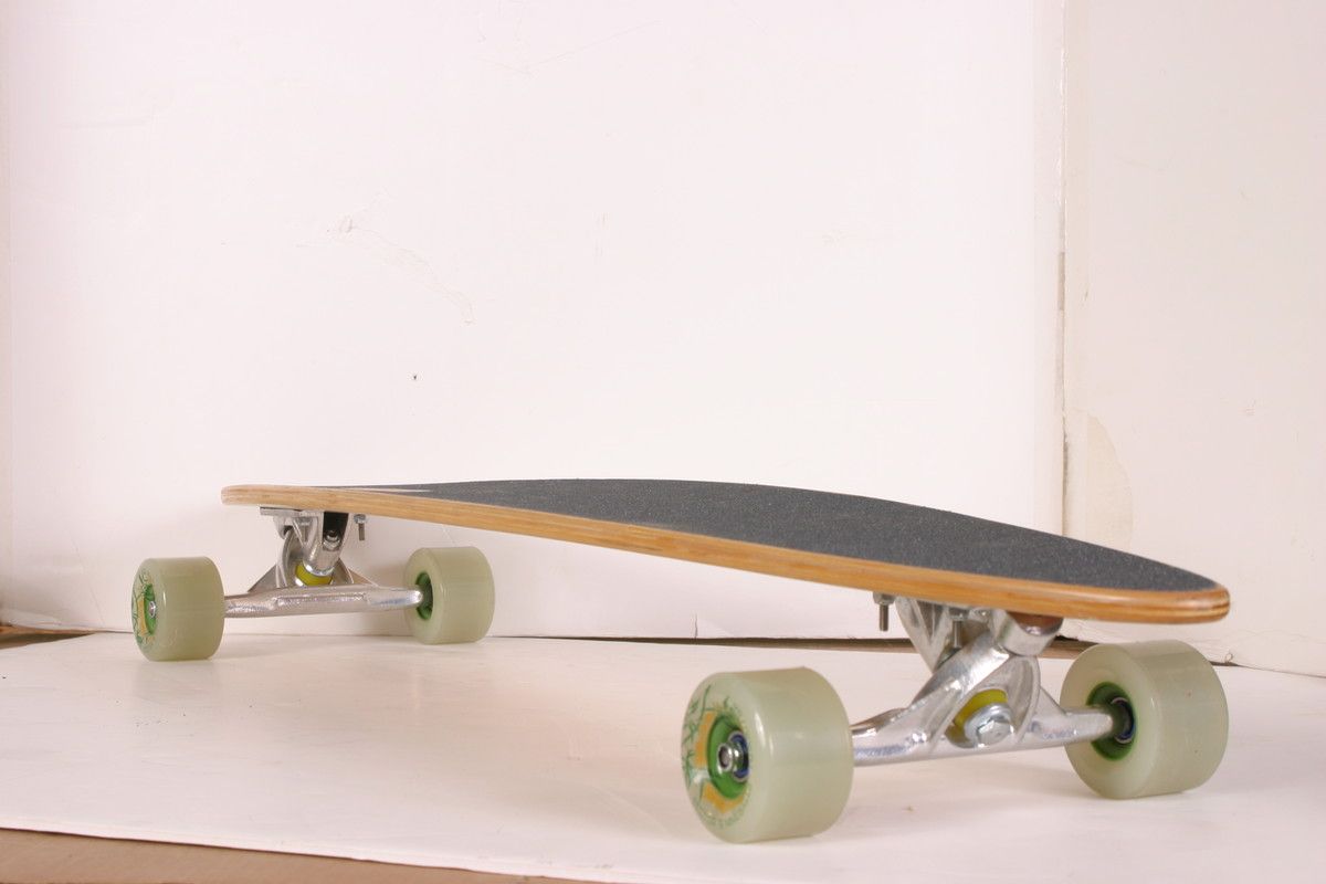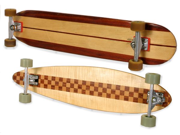 The flat pin-striped board is constructed from three thick layers of hardwood with a more rudamentary construction process.