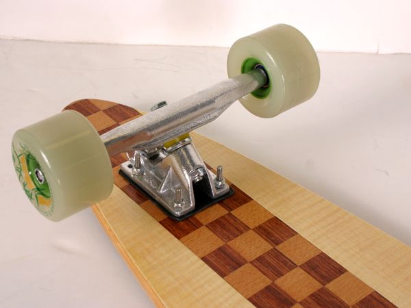 Through the years I settled on a construction process that involves laminating seven layers of maple veneer in a vacuum press and then decorating the bottom with a checkerboard pattern with a technique called marquetry. The lamination is shaped using a foam mold, giving the board convex and concave to make it easier to ride.