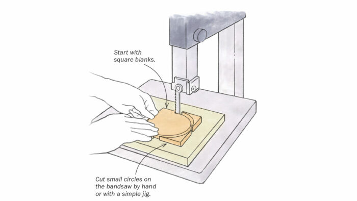 It’s fun to make your own knobs for furniture or shop use. Here’s one of my favorite approaches. Starting with square blanks, I use a simple bandsaw jig to cut circles in them. The jig is just a board with a nail or pin sticking up, which the blank pivots on. Instead of using the circles as knobs, I use the scraps, combining them as shown. To make the knobs more useful and attractive, I add sticks in the middle, joining them with a simple lap joint. Once the glue dries, I do some shaping to make the knobs more comfy and appealing. For shop and jig knobs, you can drill a hole through the middle and attach them with a bolt. To attach them to furniture, you can run a screw into the back of the knob. The center strips can be made with the same wood as the circle scraps, or the parts can be made from contrasting wood.