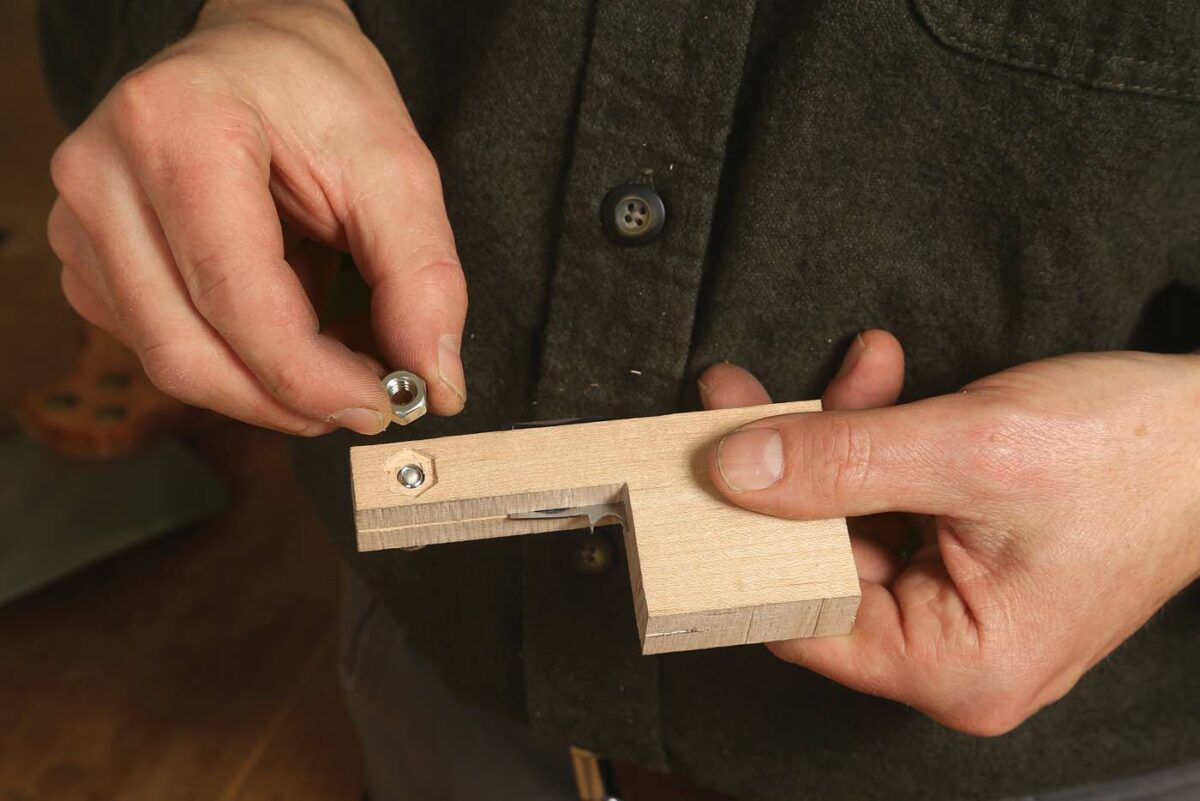 Prepare the holder. Draw a layout line on an L-shaped block, and then use a handsaw or bandsaw to cut a kerf along that line. At the end of the block, use a Forstner bit to cut a shallow countersink for a bolt head. Then drill a clearance hole for the bolt. Assembly. After sliding the cutter into the kerf in the handle, put the bolt in place, and tightly secure a nut on the end.