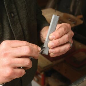 Create the cutter. Use a permanent marker to lay out the shape of your bead on the scrap-metal blank. Secure the blank in a vise, and use a round file (at 90° to the blank) to create the profile. The scratch stock will cut in both directions, so hone both faces of the cutter on a fine stone. And hone the curved edge as well.