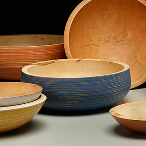 Bowls can be turned from seasoned wood, green wood, or laminated wood. The results from seasoned or unseasoned stock are similar, but the bowls produced from laminated wood are quite different. I wanted to turn some bowls, but since I don’t have a chainsaw or a drying room, using green wood seemed beyond my capability. And I couldn’t afford to purchase a large slab of seasoned hardwood either. Therefore, I turned to making bowls from glued-up wood. When I began, I did not know what form my laminations would take; the laminated bowls I had seen didn’t seem especially attractive. So I decided not to look at any how-to literature and just try it on my own. The four bowls shown here are the results of my experiments.