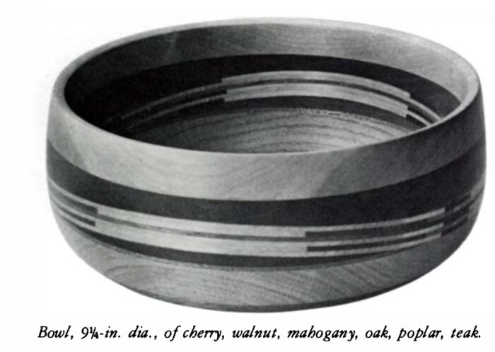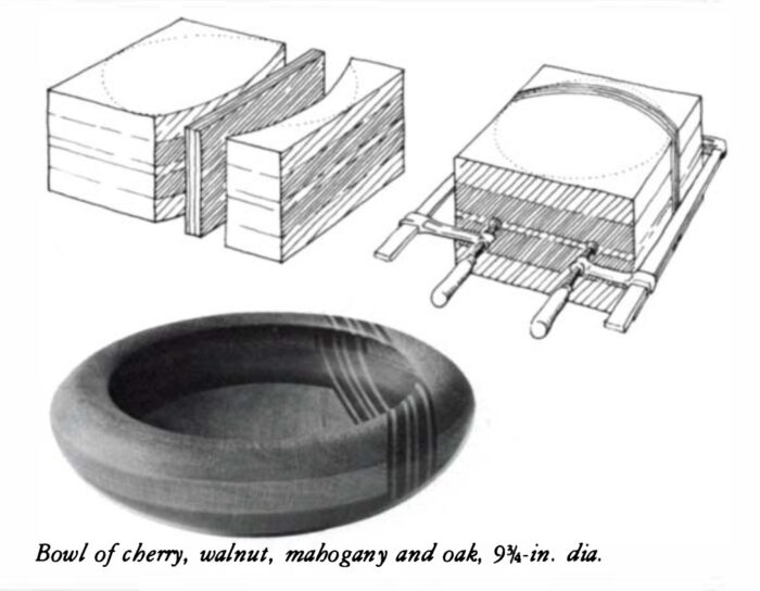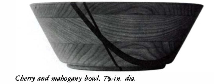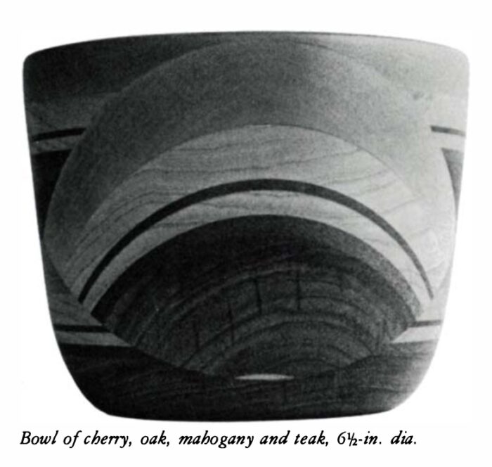 If I could have turned bowls from solid stock, I don’t know if I ever would have tried this type of lamination. But now I am hooked on the idea. The field of complex laminations is new and unexplored. Haphazard gluing can be unattractive, but with some creative thinking, the laminations can enhance the beauty of the wood. Glue lines may not be pretty, but they are no uglier than the mortar that holds bricks together. If a bricklayer makes an elegant archway, he must taper his bricks; to do so, he increases the mortar-to-brick ratio. The same is true for the woodworker. If he wants to achieve a bend or design through lamination, the glue-to-wood ratio will increase. Both cases are legitimate uses of materials, and neither should be criticized for its use of adhesives. The work should be judged by the finished product.