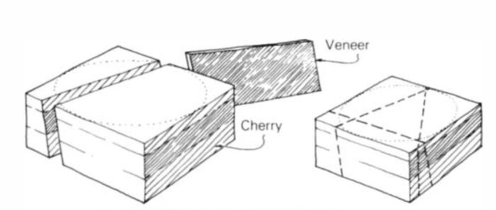 My first bowl started with a simple idea: I wanted to change the usual horizontal glue lines of a laminated bowl. I accomplished this with some risky end-grain gluing. I glued together pieces of cherry, oak, mahogany, and teak. This block was clamped to the miter gauge of the table saw for safety and accuracy. Then two careful 45° crosscuts caused a 90° chunk (a right triangular prism) to be released from the end grain, as shown in the drawing.