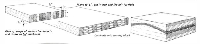For the last bowl in this series, I started with the same block as before. But this time, the arc cut through the block went along the horizontal plane. The veneer to be laminated in this space also had to be glued up. I glued strips of stake, popÂlar, oak, cherry, and walnut, all 3/4 in. by 2 in., together edge to edge. They were resawn on the bandsaw with the fence set at 3/16 in. A sharp blade is needed for this cut, or else the blade will wander. The sheets were passed through the planer to bring their thickness down to â…› in. and to remove the saw marks, thus ensuring a good glue joint. They were turned left over right, and at the end grain an inlay pattern appeared.