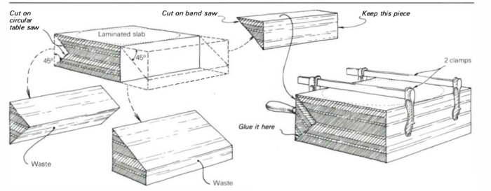 This cut had to be carefully done because any unevenness would result in a poor and potentially weak glue line. The 90° must be precise too—it is easy to check with an accurate try square. From the other end of the block, I cut the same shape, only here the grain is at a 45° angle to the hypotenuse instead of perpendicular. This cut, because of its length, must be done on the bandsaw. It will not be a glue surface, so its flatness is of no special importance. This same end is then cut square for clamping. Because of the end grain, I sized the surfaces with a liberal coat of plastic resin glue. After it soaked and dried a little, I applied some more and clamped it. The clamping procedure is very easy-two clamps will do the trick-then it’s on to the lathe.
