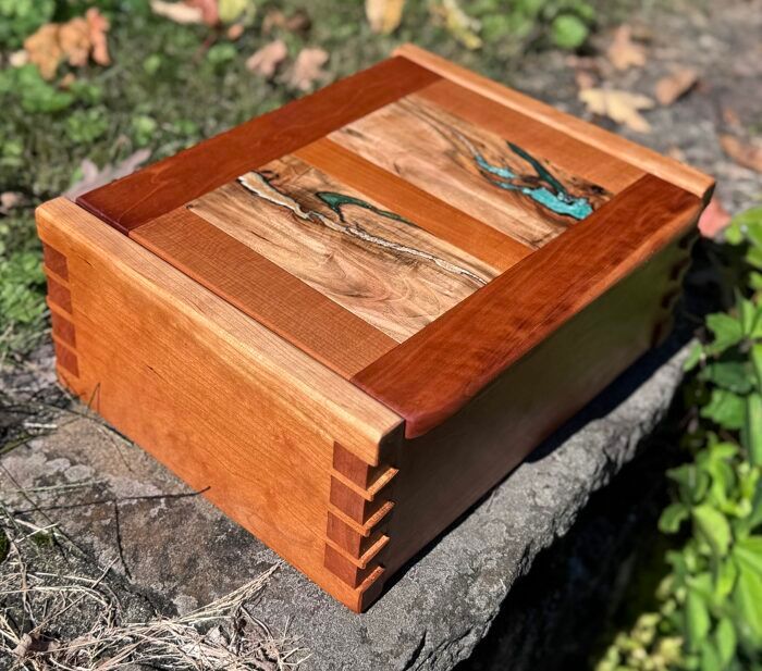 Based on the Michael Pekovich dovetailed jewelry chest from the November issue. Some color added to the top with ambrosia maple stabilized with colored epoxy.