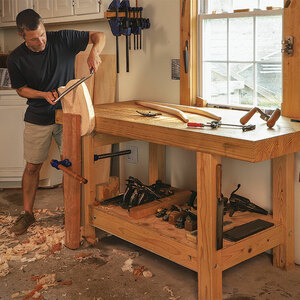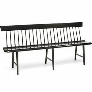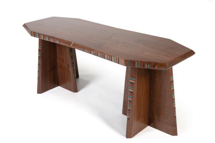 The first version of this bench was based on photos of Mayan pyramids and made with sycamore, stained green, to suggest a forest canopy. After recently visiting the pyramids of Giza, Tony made this one—identical in form, but in walnut. The simple V-shaped incisions, chiseled along tapering chamfers, are painted in the color palette commonly found in ancient Egyptian tombs and temples. TONY O’MALLEY, Emmaus, Pa.