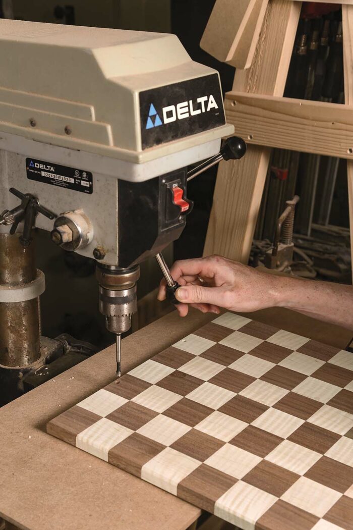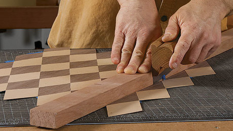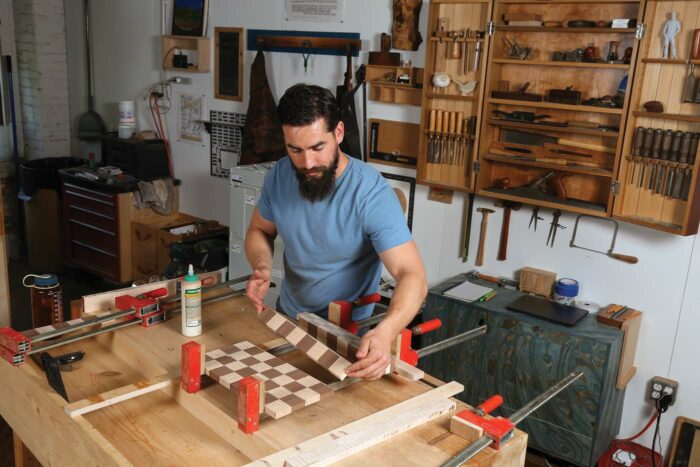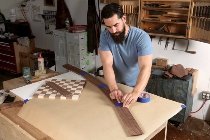 With the strips cut and dry-assembled, lift every other strip out of the assembly and rotate them end for end, creating the chessboard pattern. Take care to line up the seams; otherwise your chessboard will look more like an M. C. Escher drawing than a game board. Take your time with the glue-up and ensure it’s flat. Again, use cauls if necessary. Because you are gluing up end grain in this step, consider using Titebond Quick and Thick. TB3 will also work just fine if you seal the pores first. While you don’t see end-grain to end-grain glue-ups all the time, they are a technique that can be used successfully in non-load-bearing circumstances like this. However, if it helps you to sleep better at night, feel free to use biscuits or a few Dominoes to reinforce the joint.