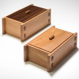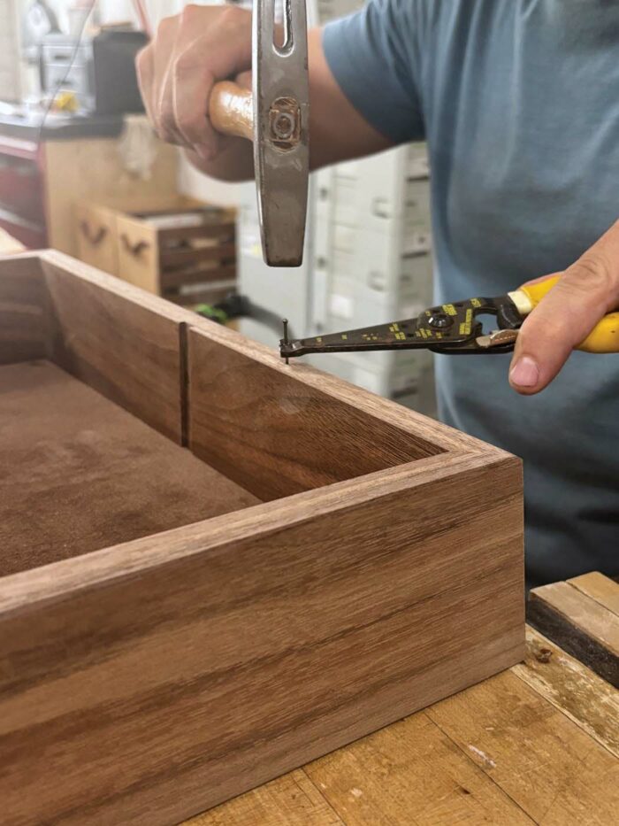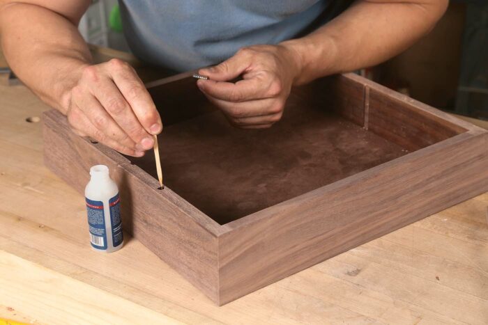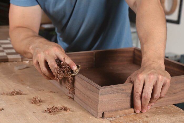 I prefer a darker wood for a base, as dark colors have more visual weight to them, grounding the object and making whatever sits atop feel a bit more important. Consequently, I’ll use more of the same straight-grained walnut that I used on the top. The joinery is miters, the bottom is trapped in a groove, and a center divider creates separate compartments for the pieces.