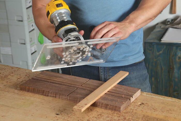To start, double-stick the pair of box sides down to your work surface, with the bottom edges touching one another. Make sure the edges are perfectly aligned; if they aren’t, your dadoes won’t be either. Next, draw a centerline. Then mark the offset from the center of your trim router to the edge of its base, mark yourself a line, and attach your makeshift fence to your workpieces using a square and some double-stick tape. Rout from the outside (top) of your workpiece toward the groove (bottom), stopping when you pierce into the groove. Turn off the router, reset on the other piece, and repeat the same operation.
