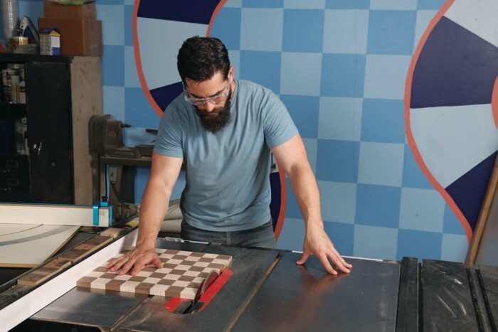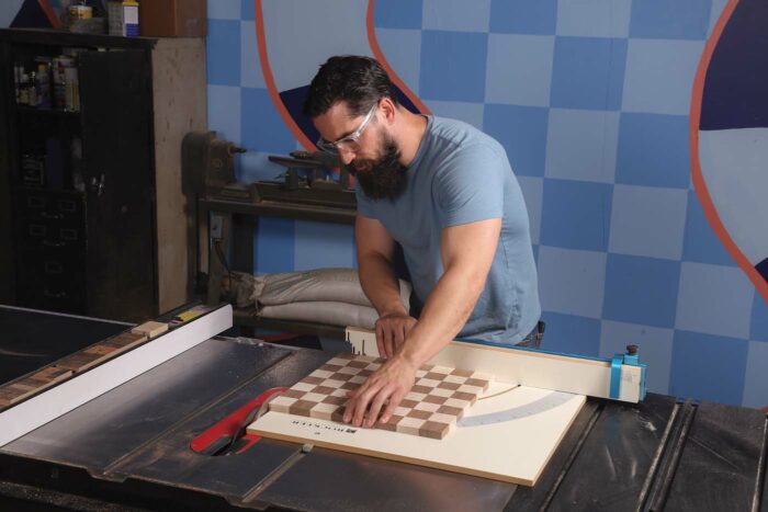 | Once the checkered glue-up is dry, make a skimming crosscut to square up two sides. | Ever so slightly rip the other two sides to square up the entire board. |