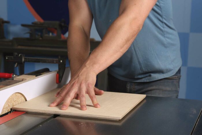 Using a 1/2-in.-thick piece of plywood (or solid wood), cut the bottom piece square. Then, using a dado stack on the table saw, cut a rabbet around the perimeter to create a tongue on all four sides. Check the fit on the grooves and skim off another pass if needed. Be mindful that your bottom will be thicker when you attach your suede liner, so be sure to account for that when cutting your groove.