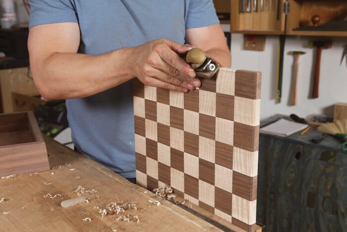After a couple hours, remove the clamps and blue tape and prep the outside walls of the box. A light sanding or a few passes with a sharp plane will do the trick. Then, with a block plane, put a heavy chamfer around the bottom edge of the chessboard and the top outside edge of the box. Be sure the chamfers are sizable, as they will act as a finger pull to remove the board from the box.