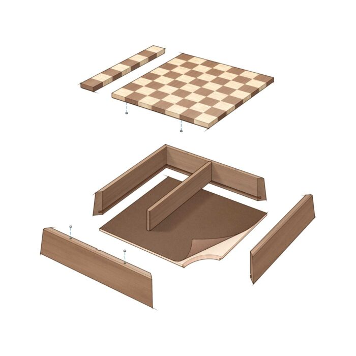 This particular chessboard employs solid-wood construction, so considering wood movement is crucial. Within just a few years, a 16-in.-wide board will blow apart any box or cabinet that attempts to contain it; a solid maple board that wide can move up to 5/16 in. between the wet and dry seasons! Beyond careful consideration of how the material moves, I’ll show you what I like to call the poor man’s compound miter, creating a geometric base that plays nicely with the pattern on the board itself.