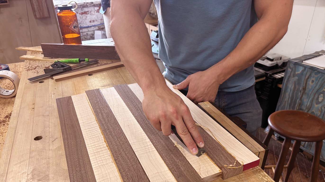 After thicknessing, I chop my boards to around 20 in. long and then take them to the table saw. This is where the first critical measurement comes into play. Set the fence carefully to 2 in., and rip four strips of walnut and four strips of maple. Be sure to have a good, sharp blade, as any blade deflection or burn will show through on the final piece. Try to leave the saw set up if you can; it will make life much easier down the road. With the strips ripped to final width, lay them up in an alternating pattern and edge-glue them. I like to use Titebond III here, as there are multiple strips and the extra open time of TB3 is helpful for alignment purposes, though it’s not critical. Keep the strips flat, and use cauls if necessary.