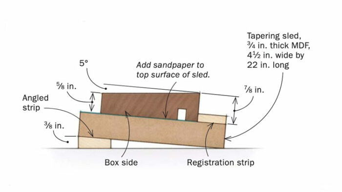 To make a very simple tapering sled for the planer, grab some scrap 3/4-in. MDF and a small strip of wood. Set your saw to about 5° and rip a strip that is 3/8 in. at its thickest and 22 in. long. Glue the strip on one side of your MDF. You have just made a tapering sled. I add another registration strip on the top and also a little sandpaper to prevent my pieces from slipping.